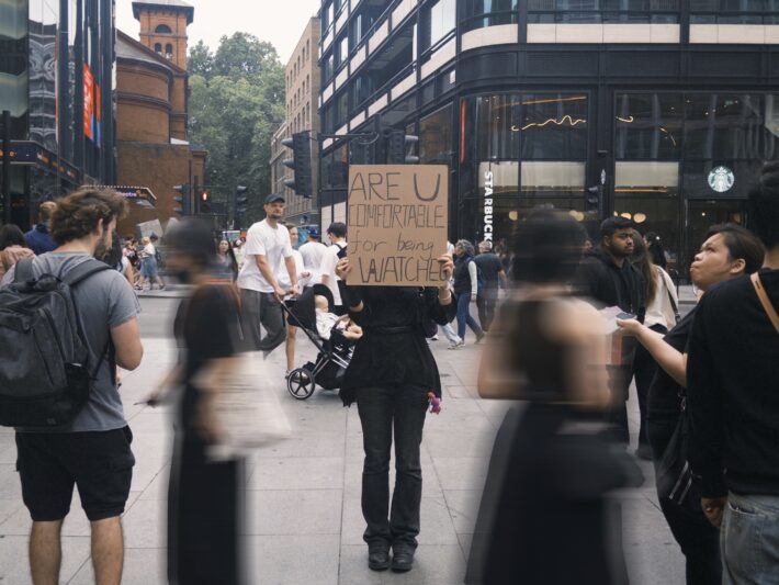 On August 16, about 25 protesters rallied outside London’s Tottenham Court Road Station to stand against such digital violence. Demonstrators wore purple masks, distributed informational flyers, and invited passersby to show solidarity through an online emoji campaign.