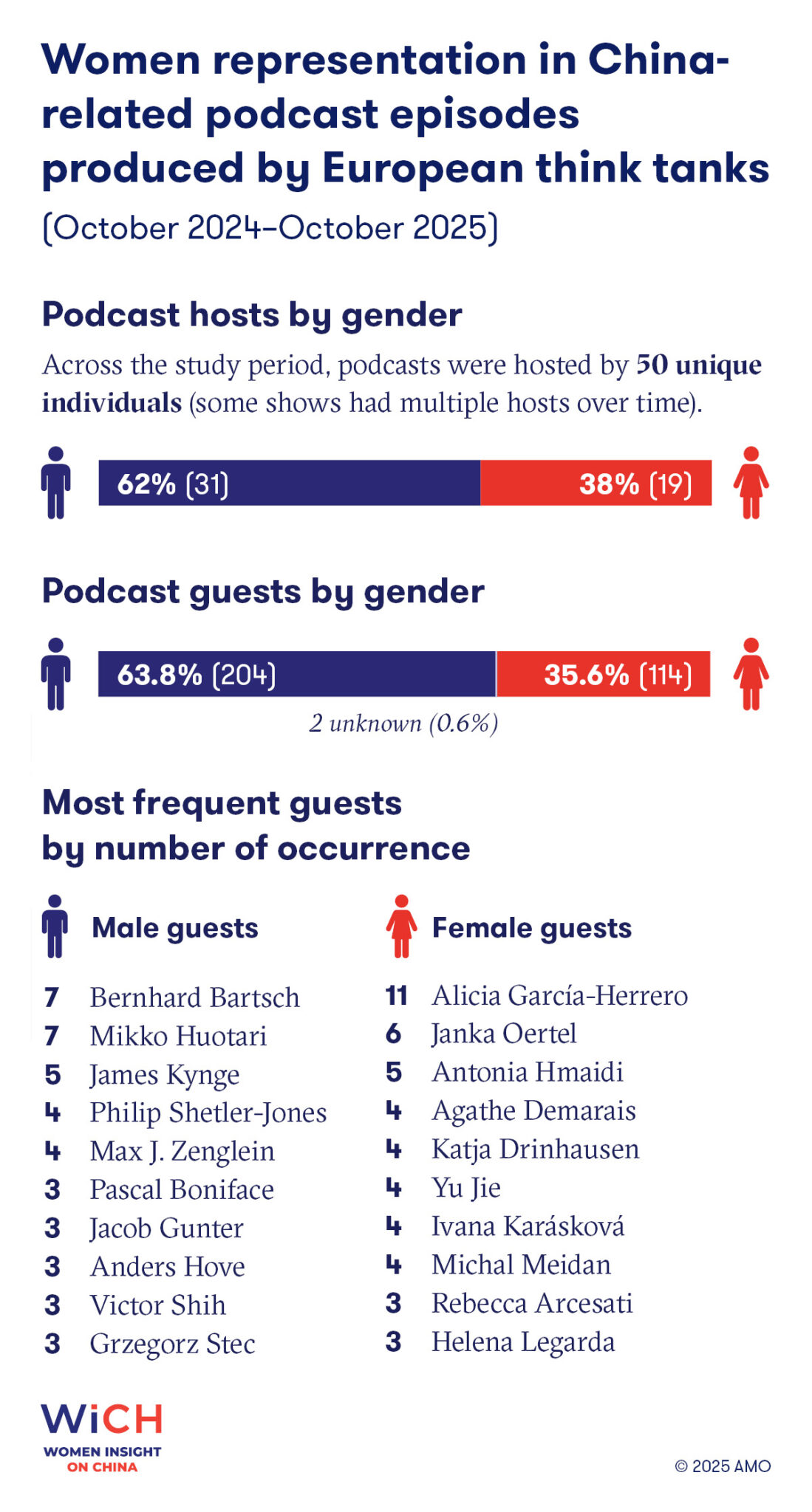 Podcast episodes produced by renowned think tanks and universities leading the China research in Europe were not better: 63.8 percent of guests and 62 percent of hosts were men.