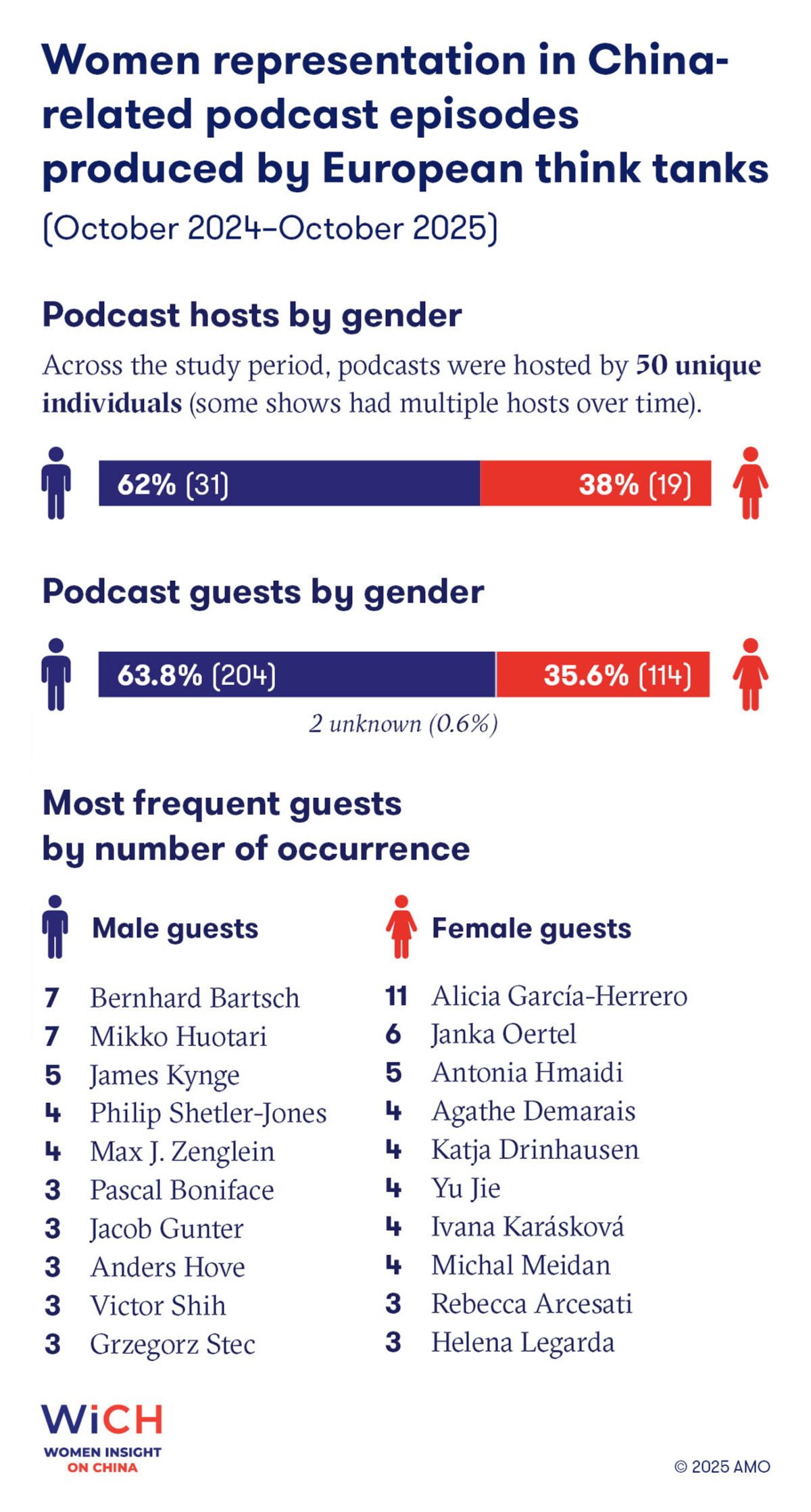 Podcast episodes produced by renowned think tanks and universities leading the China research in Europe were not better: 63.8 percent of guests and 62 percent of hosts were men.