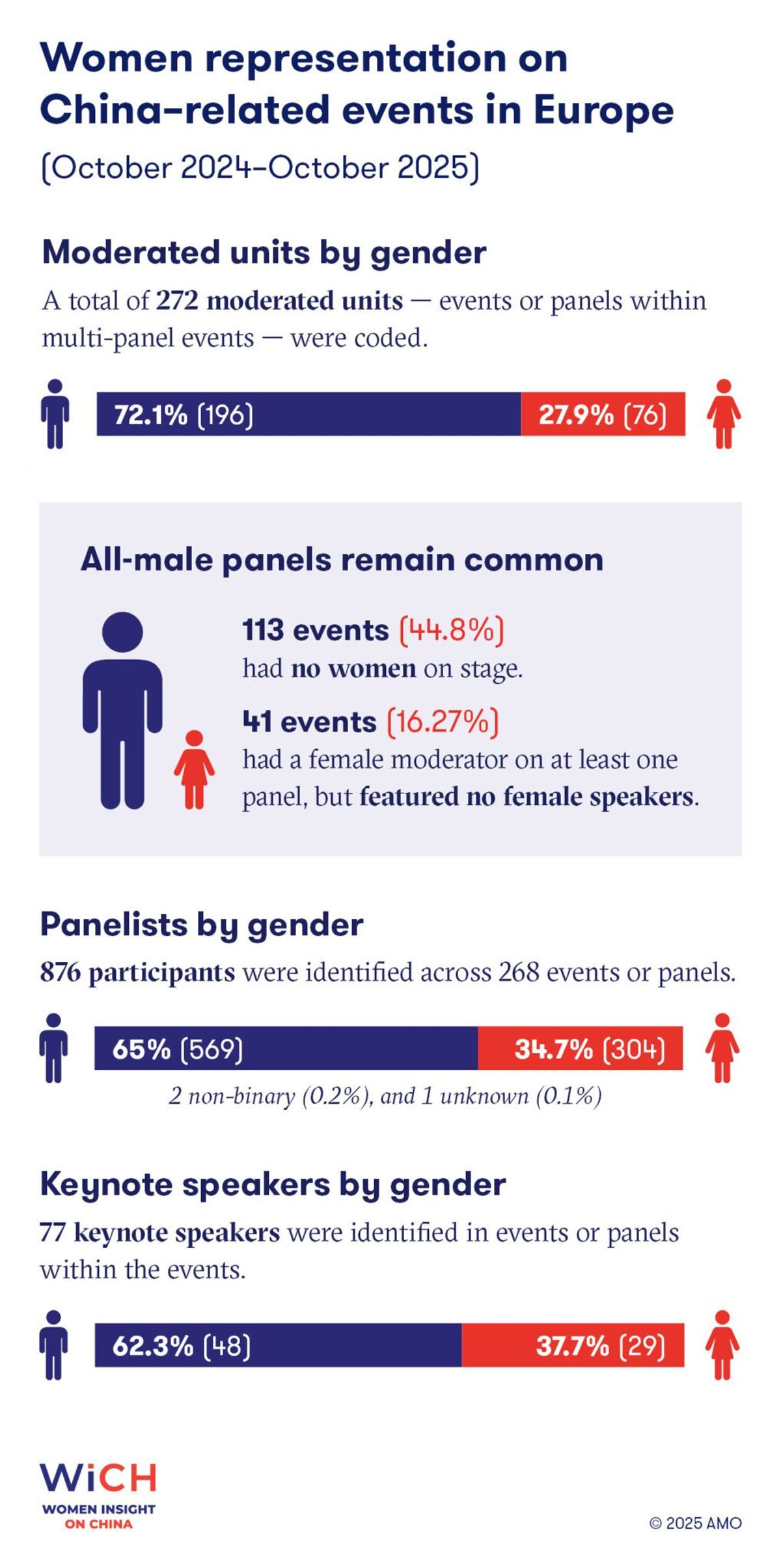 Between October 2024 and October 2025, Women Insight on China (WiCH) initiative tracked gender representation across 268 events and 210 podcast episodes organized by 63 European think tanks. The results are as revealing as they are sobering: men made up roughly two-thirds of all speakers, while women accounted for just 34.7 percent. Two participants identified as non-binary, and one preferred not to disclose gender identity.