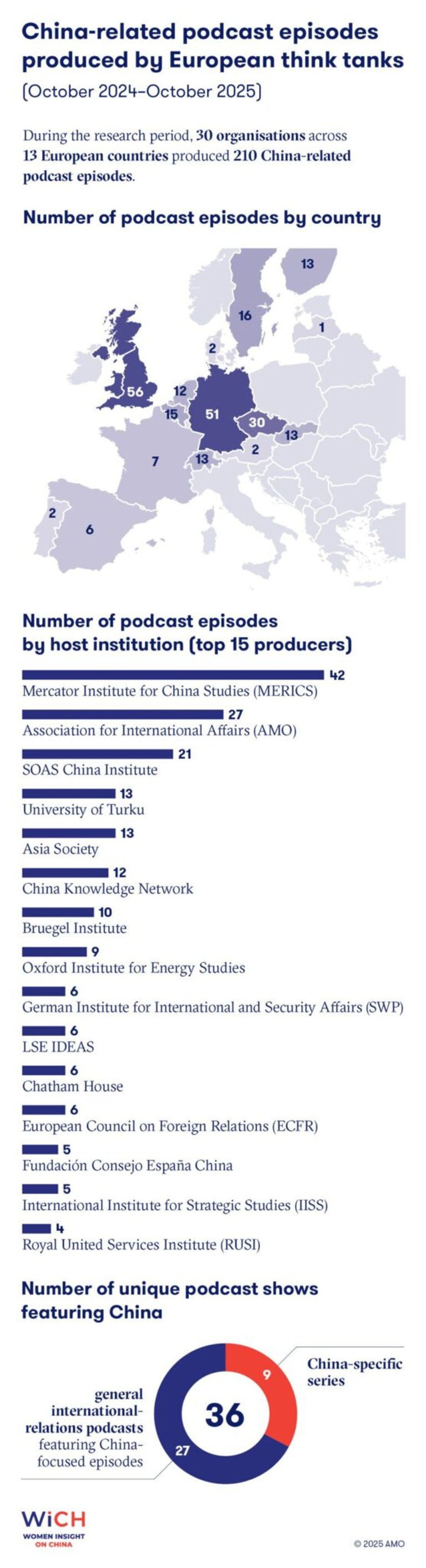 While podcasts might seem a more flexible and accessible format than events, the WiCH data reveal another structural quirk. The most frequent female voice in Europe’s China-related podcasts, Alicia García-Herrero, owes her prominence largely to co-hosting Bruegel’s own China-focused show. Out of her eleven podcast appearances during the research period, ten were on her own platform. A similar pattern emerges elsewhere: MERICS experts such as Rebecca Arcesati, Katja Drinhausen, Antonia Hmaidi and Helena Legarda appeared almost exclusively (within the constraints of the chosen methodology, i.e., focusing on Europe only) on their institution’s in-house podcasts, while Ivana Karásková, founder of CHOICE, featured primarily on her own initiative’s channels. In other words, female analysts are most frequently heard when they – or their institutions – control the microphone. So if you want to be heard as a female China analyst, the best way may simply be to join an institution that produces China-focused podcasts – or start your own.