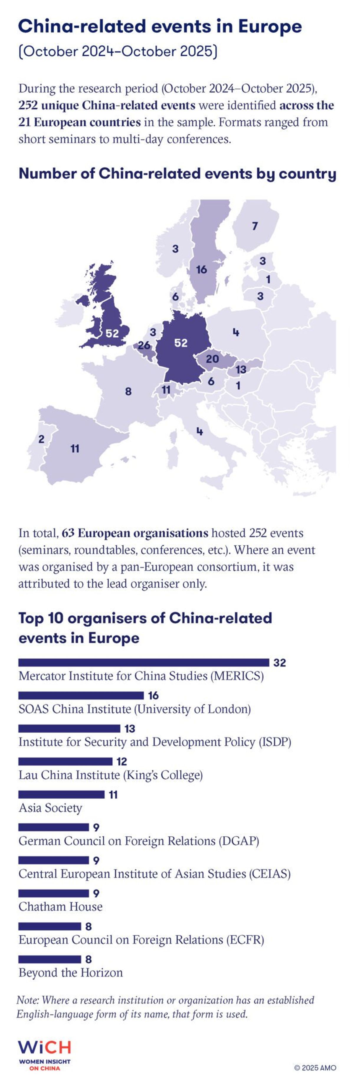 The data suggest that differences in gender representation are not primarily geographical but rather reflect distinct institutional cultures and event-planning habits. Across Europe, well- and poorly-performing organisations can often be found within the same country – and sometimes even within the same city. Some institutions have managed to ensure at least partial gender balance, while others continue to feature programs or podcast line-ups dominated almost entirely by men. These discrepancies point less to national context than to how individual organisations approach visibility, expertise, and inclusion when deciding who gets to speak about China.